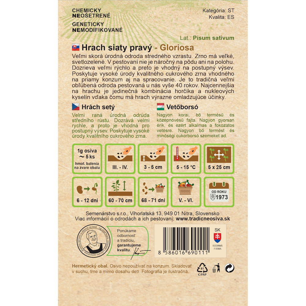 Veľmi skorá úrodná odroda stredného vzrastu. Zrno má veľké, svetlozelené. V pestovaní nie je náročný na pôdu ani na polohu. Dozrieva veľmi rýchlo a preto je vhodný na postupný výsev. Poskytuje vysoké úrody kvalitného cukrového zrna vhodného na priamy konzum aj na spracovanie. Je to tradičná veľmi obľúbená odroda pestovaná u nás vyše 40 rokov. Najcennejšia na hrachu je jedinečná kombinácia horčíka a nukleových kyselín vďaka čomu má hrach výrazne omladzujúce účinky.