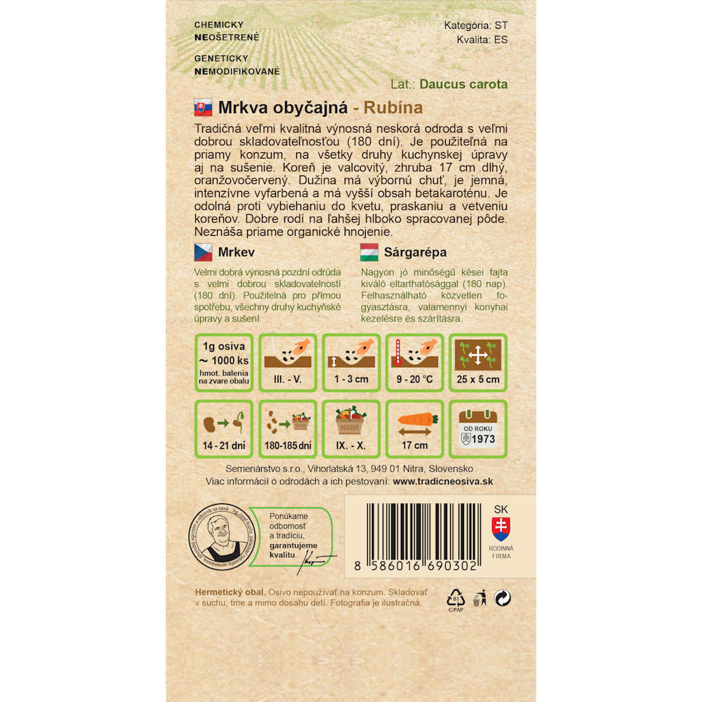 Tradičná veľmi kvalitná výnosná neskorá odroda s veľmi dobrou skladovateľnosťou (180 dní). Je použiteľná na priamy konzum, na všetky druhy kuchynskej úpravy aj na sušenie. Koreň je valcovitý, zhruba 17 cm dlhý, oranžovočervený. Dužina má výbornú chuť, je jemná, intenzívne vyfarbená a má vyšší obsah betakaroténu. Je odolná proti vybiehaniu do kvetu, praskaniu a vetveniu koreňov. Dobre rodí na ľahšej hlboko spracovanej pôde. Neznáša priame organické hnojenie.