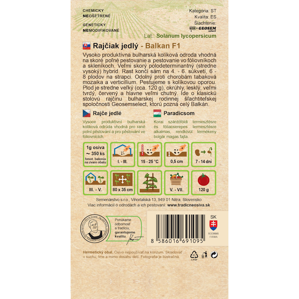 Vysoko produktívna bulharská kolíková odroda vhodná na skoré poľné pestovanie a na pestovanie vo fóliovníkoch a skleníkoch. Veľmi skorý polodeterminantný (stredne vysoký) hybrid. Rast končí sám na 4. - 6. súkvetí, 6 - 8 plodov na strapci. Odolný proti chorobám tabaková mozaika a verticillium. Pestujeme s kolíkovou oporou. Plod je stredne veľký (cca. 120 g), okrúhly, lesklý, veľmi tvrdý, červený a hlavne veľmi chutný. Ide o klasickú stolovú rajčinu bulharskej rodinnej šľachtiteľskej spoločnosti Geosemselect, ktorú pozná celý Balkán.