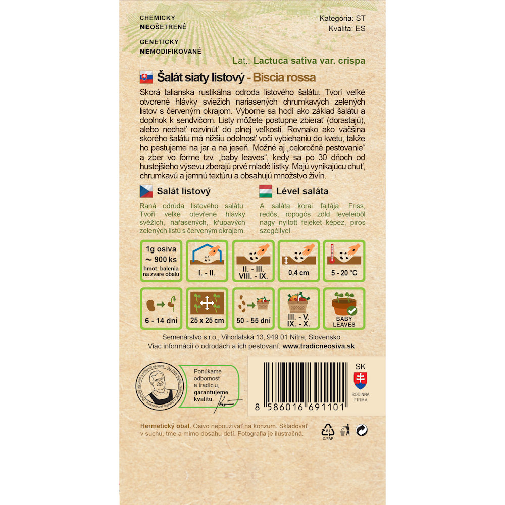 Skorá talianska rustikálna odroda listového šalátu. Tvorí veľké otvorené hlávky sviežich nariasených chrumkavých zelených listov s červeným okrajom. Výborne sa hodí ako základ šalátu a doplnok k sendvičom. Listy môžete postupne zbierať (dorastajú), alebo nechať rozvinúť do plnej veľkosti. Rovnako ako väčšina skorého šalátu má nižšiu odolnosť voči vybiehaniu do kvetu, takže ho pestujeme na jar a na jeseň. Možné aj "celoročné pestovanie" a zber vo forme tzv. "baby leaves", kedy sa po 30tich dňoch od hustejšieho výsevu zberajú prvé mladé lístky. Majú vynikajúcu chuť, chrumkavú a jemnú textúru a obsahujú množstvo živín.