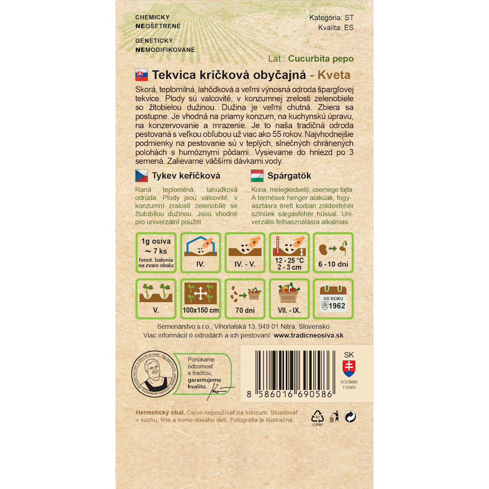 Plody sú valcovité, v konzumnej zrelosti zelenobiele so žltobielou dužinou. Dužina je veľmi chutná. Zbiera sa postupne. Je vhodná na priamy konzum, na kuchynskú úpravu, na konzervovanie a mrazenie. Je to naša tradičná odroda pestovaná s veľkou obľubou už viac ako 55 rokov. Najvhodnejšie podmienky na pestovanie sú v teplých, slnečných chránených polohách s humóznymi pôdami. Vysievame do hniezd po 3 semená. Zalievame väčšími dávkami vody.