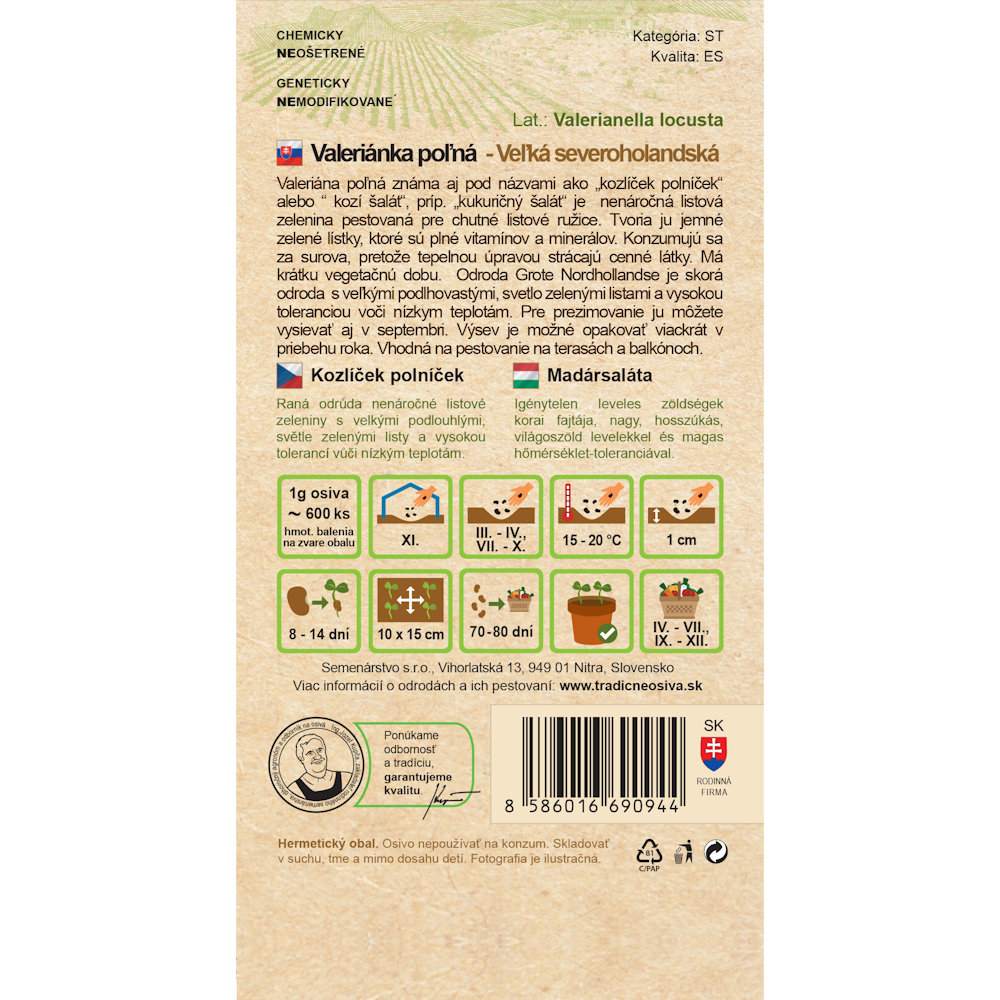 -Valeriána poľná známa aj pod názvami ako "kozlíček polníček" alebo " kozí šalát", príp. "kukuričný šalát" je nenáročná listová zelenina pestovaná pre chutné listové ružice. Tvoria ju jemné zelené lístky, ktoré sú plné vitamínov a minerálov. Konzumujú sa za surova, pretože tepelnou úpravou strácajú cenné látky. Má krátku vegetačnú dobu. Odroda D'Olanda a Seme Grosso je skorá odroda s veľkými podlhovastými, svetlo zelenými listami a vysokou toleranciou voči nízkym teplotám. Pre prezimovanie ju môžete vysievať aj v septembri. Výsev je možné opakovať viackrát v priebehu roka. Vhodná na pestovanie na terasách a balkónoch.